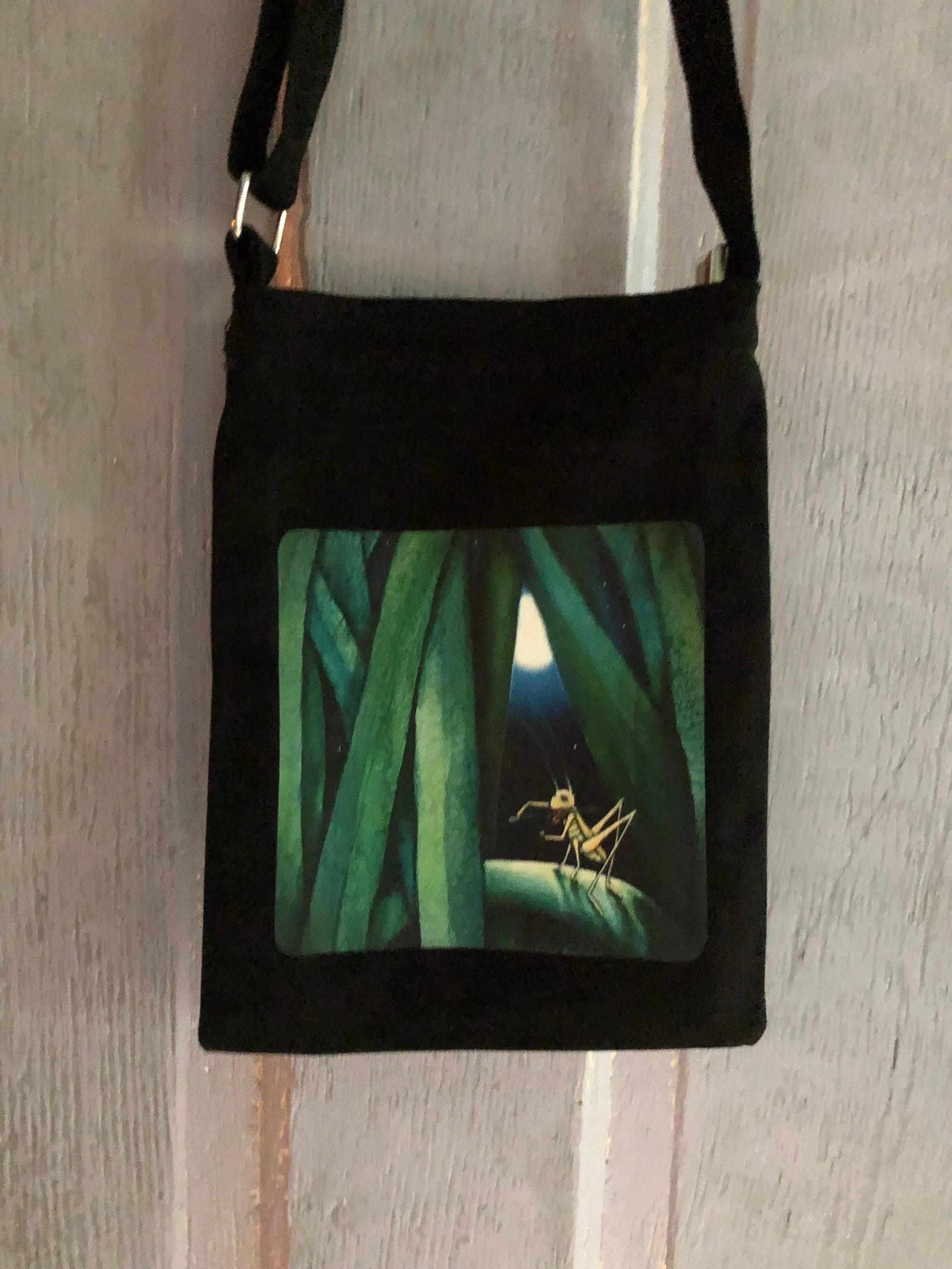 My original art on a crossbody bag. The bag is black canvas, 9” x 7” body with a zipper closure. It has an adjustable shoulder strap with a 12” to 23- 1/4” drop.